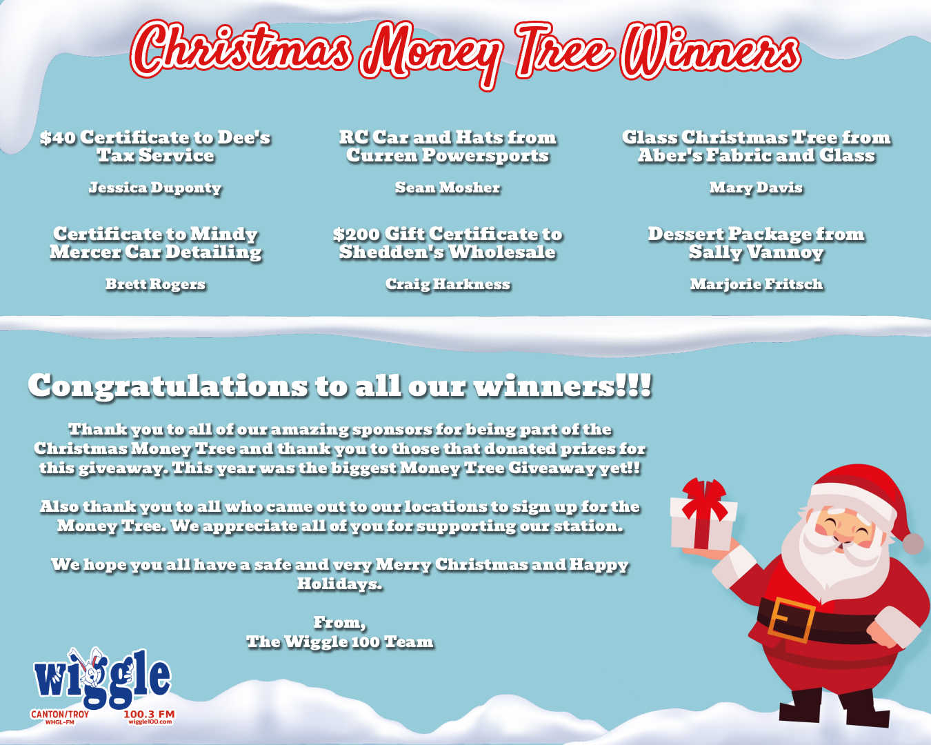 Wiggle 100’s Christmas Money Tree is back! Below is a list of all the dates, times, and locations that we will be set up with the Money Tree. Come on down to any of our money tree locations to register for a chance to win our $1,000 Grand Prize! As we get closer, we’ll be adding more dates and prizes! Keep checking back for more updates!
